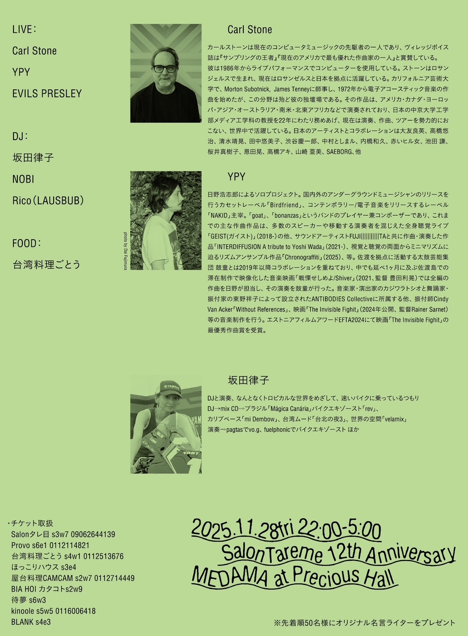 Carl Stone returns to Sapporo after a more than twenty year absence. The occasion is the 12th AnniversaryParty for Salon タレ目. Tickets are available by phone pre-order to 09062644139. Other ticket linck can be found on the Precious Hall website listed here. If you are anywhere nearby, or even if you aren’t, you will want to attend! More details coming soon!
