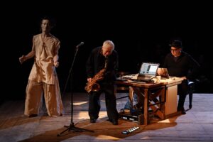I’ve had the pleasure of collaborating with saxophonist Yasuaki Shimizu several times over the years, starting with the Aichi Triennale in 2013 when we appeared together and performed a collaborative piece titled Just Breathing. Since then we’ve worked as a duo at various venues in Japan and shared a bill at the Barbican Center in London. November 1st was an exciting extension, when we were joined by the astounding butoh performer Taketeru Kudo for a one night show at Za Koenji Theater in Tokyo. It was gratifying to see positive notices from critics in Japan and even Mark Swed of the Los Angeles Times was in attendence and wrote a profile of yours truly, which you can read here if you are a subscriber and here if you are not.