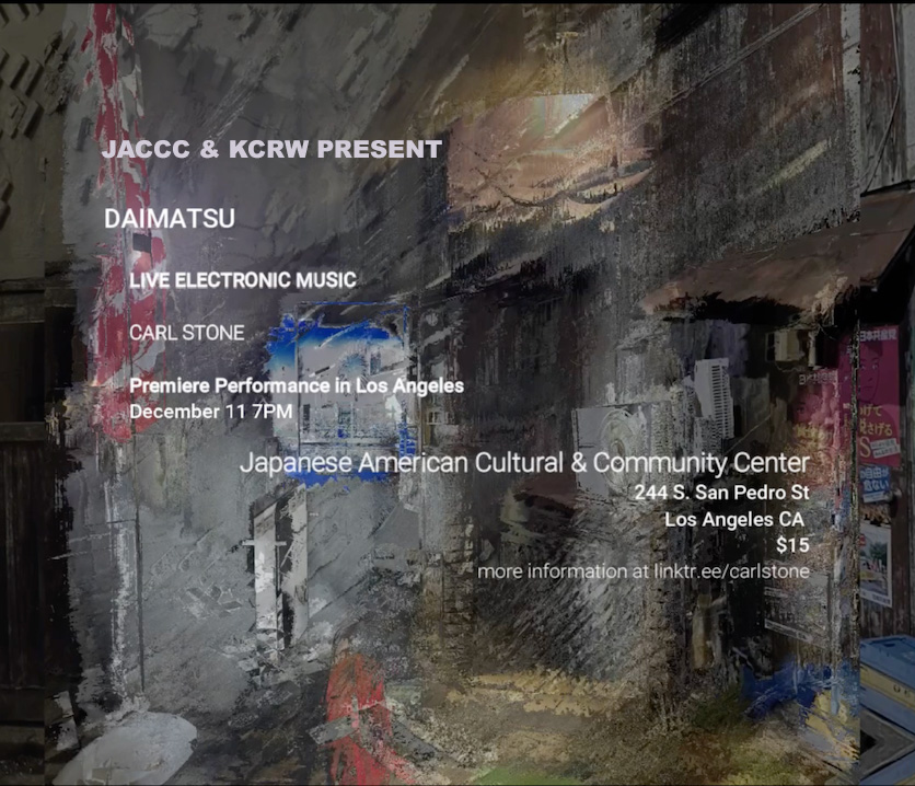 JACCC & KCRW Music present the Los Angeles premiere of Carl Stone’s one hour work DAIMATSU. Daimatsu is an electronic music performance spun from field recordings captured in both the US and Japan. These elements include shomyo chant recorded during the Goma Fire Ceremony at the Koyasan Temple in Little Tokyo, tingsha cymbals from Tibet, instruments from Gagaku (the ancient court orchestra of Japan), and the sound of water boiling in preparation of tea, as well as secular sound elements recorded in Tokyo and Gifu. Carl Stone mixes these elements in performance in order to create a deep and meditative sound space that is intended to fit perfectly to the location at the ground level of the JACCC, viewing the James Irvine Japanese Garden.